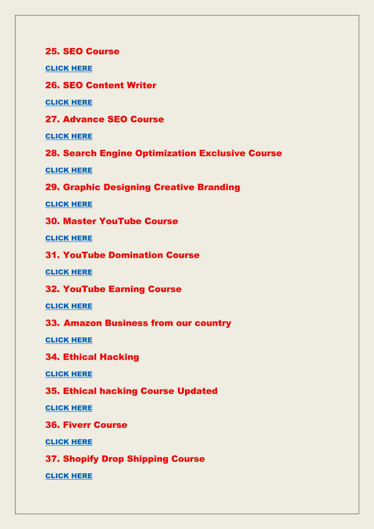 डिजिटल मार्केटिंग ऑनलाइन बिजनेस और फ्रीलांसिंग कंप्यूटर और आईटी स्किल्स ग्राफिक डिजाइन और वीडियो एडिटिंग यूट्यूब ब्लॉगिंग और कंटेंट क्रिएशन स्टॉक मार्केट और फाइनेंस बेसिक्स पर्सनैलिटी डेवलपमेंट और कम्युनिकेशन स्किल