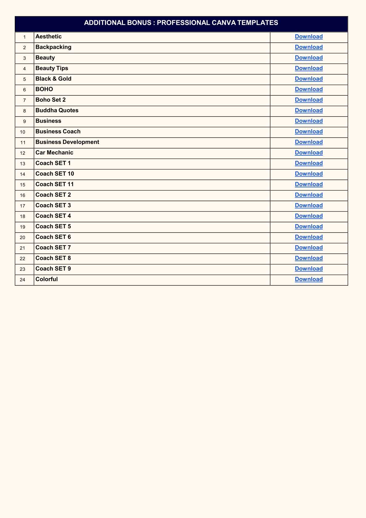 यह एक ऑल इन वन डिजिटल बंडल है जिसमें 100 से अधिक कैटेगरी के प्रोफेशनल कैनवा टेम्पलेट्स शामिल हैं।ब्यूटी, बिजनेस, डिजिटल मार्केटिंग, हेल्थ, फिटनेस, फूड, फैशन, जिम, कोचिंग, हाउस क्लीनिंग, लॉ फर्म, लाइफ कोच, मोटिवेशनल कोट्स, सोशल मीडिया पोस्ट्स और बहुत सारी निच के रेडीमेड डिजाइन इसमें दिए गए हैं।
