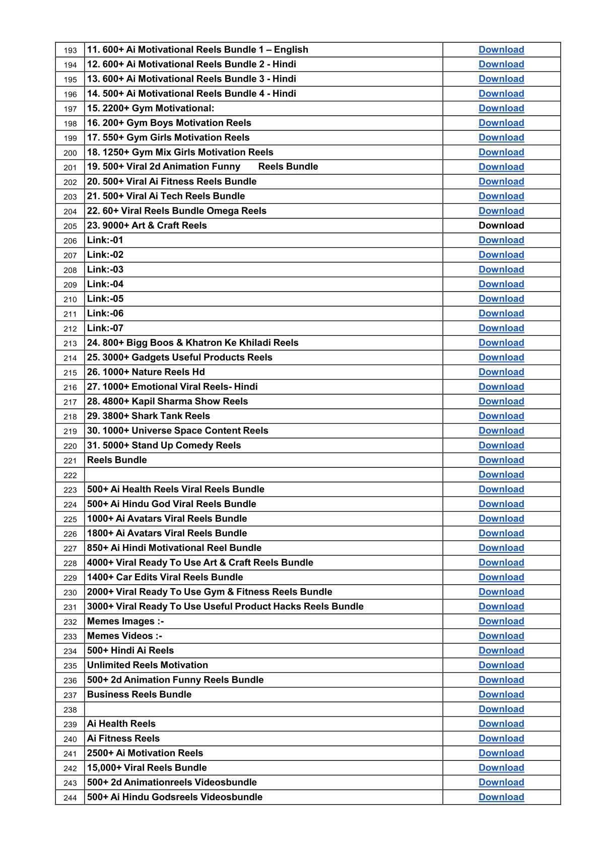 Instagram reels YouTube shorts और Facebook videos के लिए ready to use viral reels bundles दिए गए हैं जिनमें AI motivational reels fitness reels health reels comedy reels business reels car reels gadgets reels और Hindi English दोनों भाषाओं के reels शामिल हैं